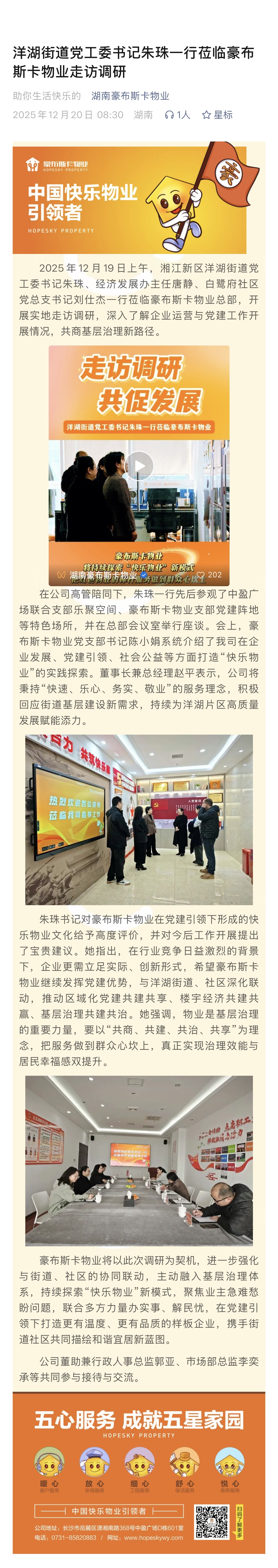 洋湖街道党工委书记朱珠一行莅临豪布斯卡物业走访调研